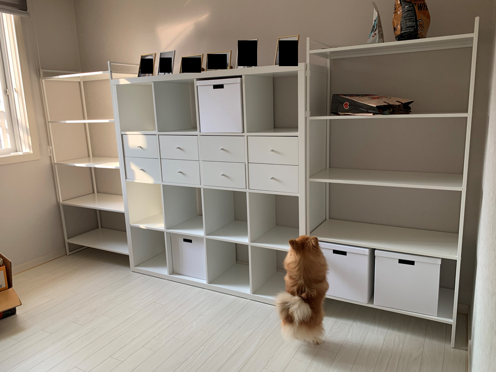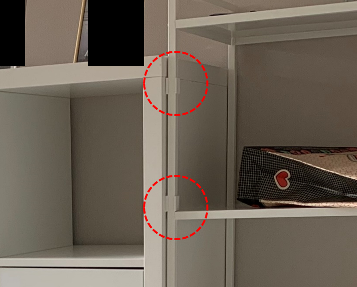 하지만 여기서 포기할순 없다... 환불도 불가능한 상품..두개를 합치면 12만원인데 버릴순 없었다 ㅋㅋㅋㅋ 그래서 똑띠 남편이 생각해낸 방법은바로 선반들끼리 연결하는 것!!! 위에 강아지가 있는 사진을 자세히 보면 아래처럼 연결되어있다.