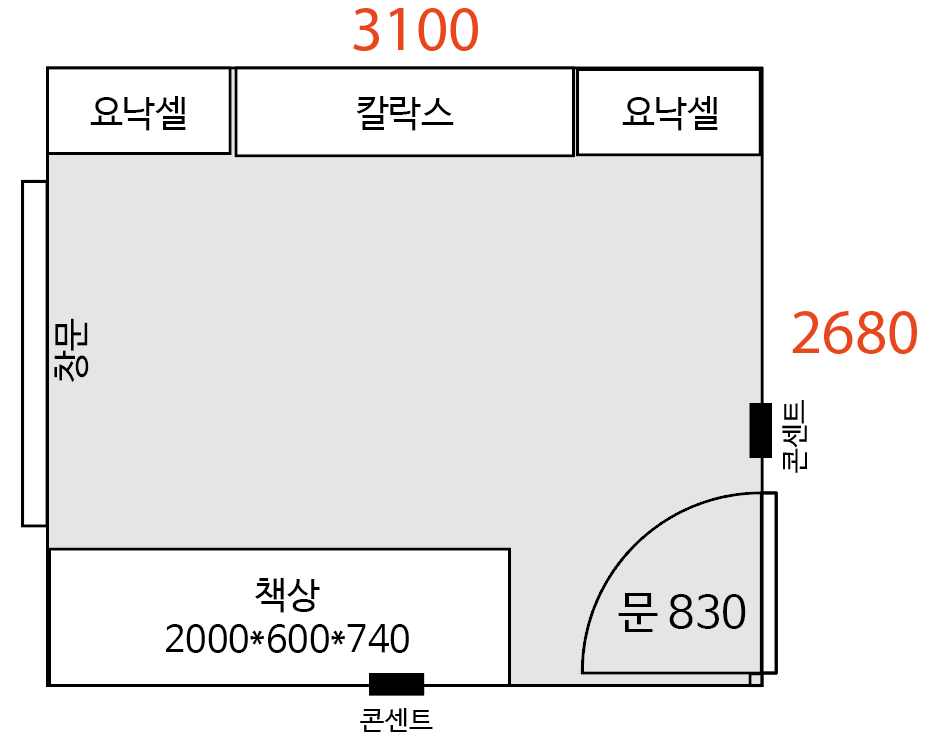 사이즈 적절한 것을 찾아서 하나하나 배치해보고 그 중에 가장 끼리끼리 잘 맞을 만한 아이들로 추렸다. 서재가 될 공간의 사이즈는 3100*2680이지만 문 열리는 공간과 콘센트 위치를 고려하여 책상과 책장들을 배치해야 나중에 다시 옮기는 삽질을 하지 않을 것 같아 모두 꼼꼼하게 기록!