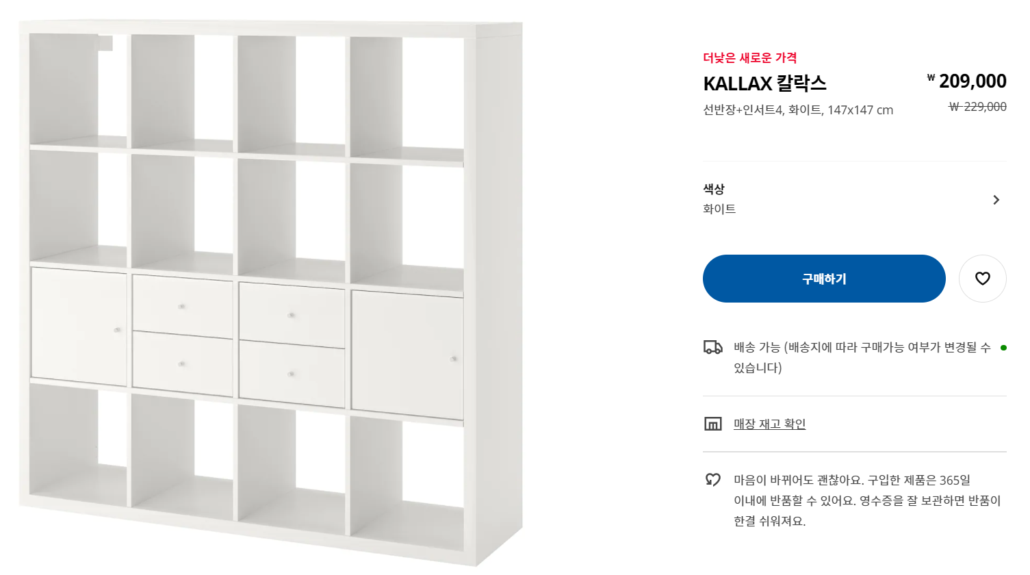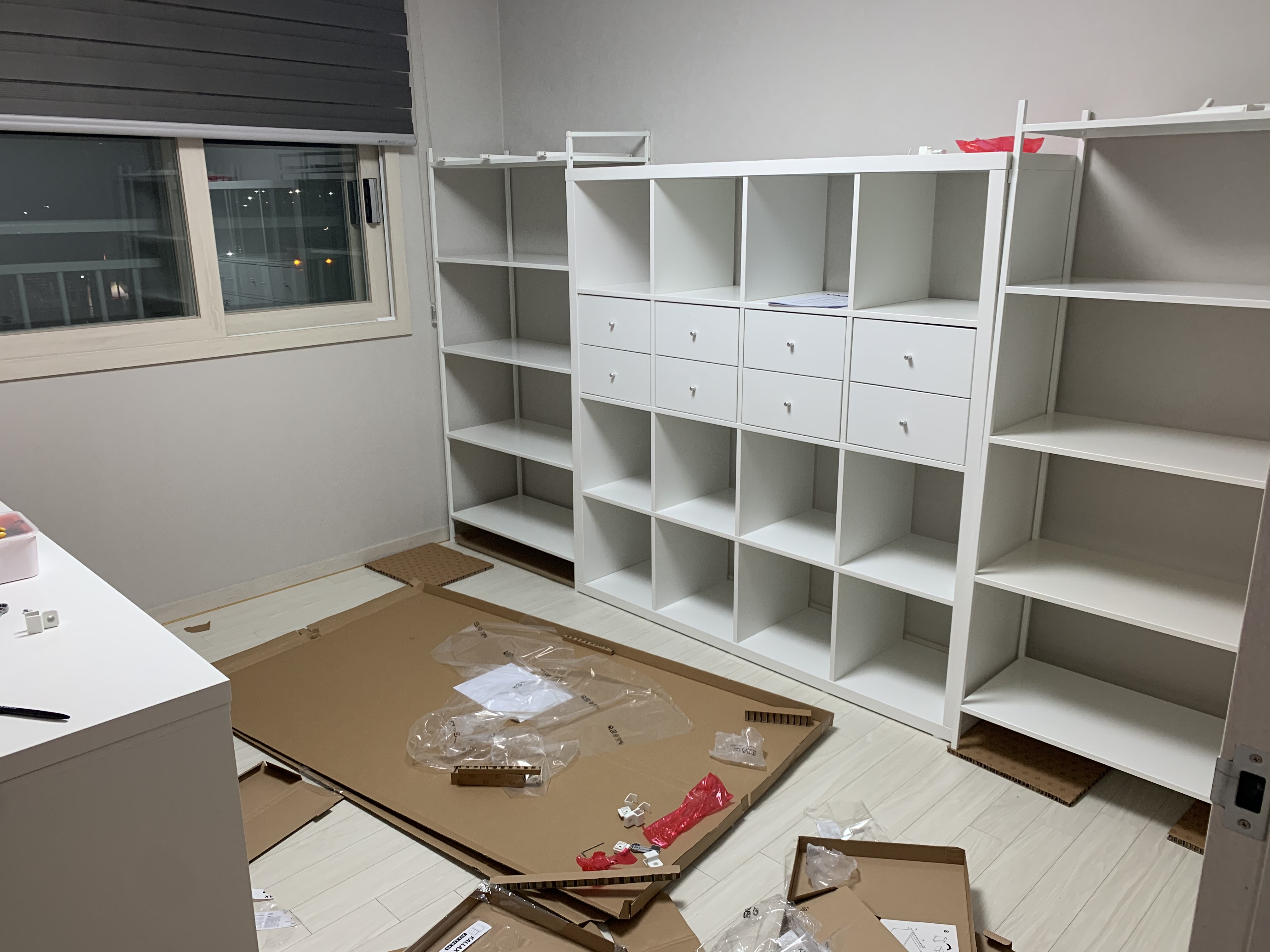 생긴거나 가격이나 여러면에서 가장 적절해보였다. 아직 우리의 짐이 얼마나 될 지 파악되진 않은 상태이지만 저 네모 칸들 안에 박스를 넣어 그 박스 안에 짐을 넣어 진열하는 식으로 하면 지저분해 보일 것도 없을 것 같았다! 왠지 모르게 조립도 어려워보이진 않았다 ㅋㅋ(어렵진 않지만 계속 쾅쾅 두드려야 해서 엄청나게 시끄럽다는 후문)