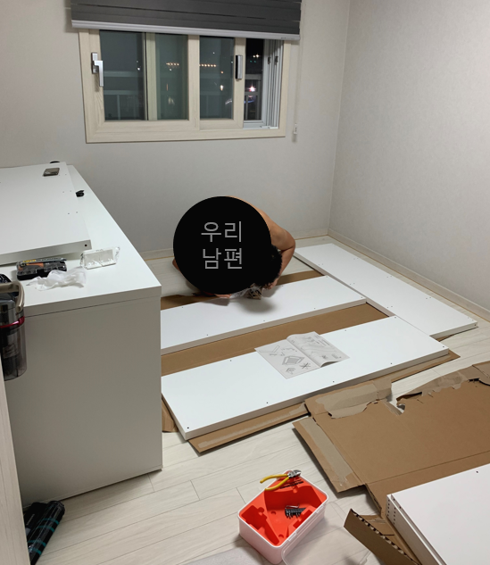 생각보다 쾅쾅 두드릴 일이 많기 때문에 종이 박스도 그냥 깔아둔채로 하는게 좋다. 그리고 되도록이면 사람들이 외출 많이 했을 것 같은 시간에 하는게 나을듯. 우리는 저녁먹는 시간 쯤 해서 정말정말 눈치가 보였다ㅠㅠㅋㅋㅋ 그래서 저녁시간에 다 완성은 포기하고 다음날 이어서 조립 완성.
