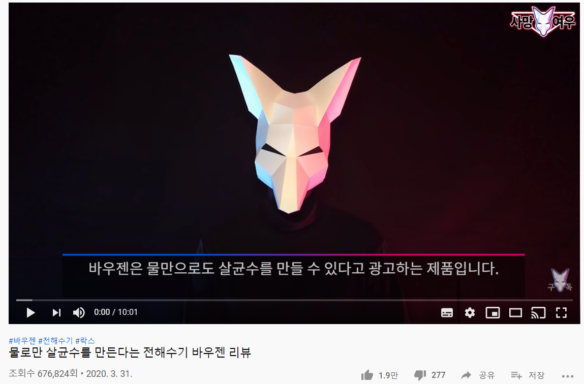 살균이 얼마나 되고 있는지 눈으로는 당연히 확인 불가능하다. 그런데 저 위의 채널에 가보면 살균 효과는 확실하게 있는 것으로 판명되었다. 그리고 시각적으로는 확인할 수 없지만 후각적으로는 너무나도 확실하게 확인 가능한것이, 뿌리면 진짜 무슨 양호실 냄새 같은게 난다!! 너무 너무 신기하게도 ㅋㅋㅋㅋ 물이었는데.. 갑자기 소독약 냄새가 남!!!